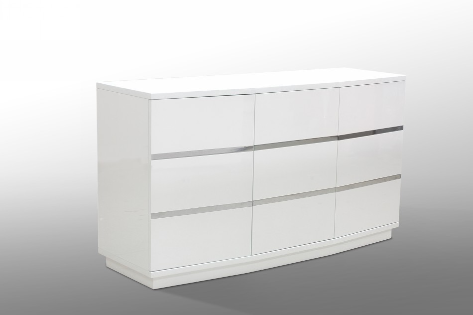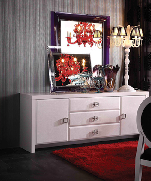 High white 4-door buffet with crocodile texture lacquer finish. Inside houses three shelves. Touch opening mechanism. Also available in black crocodile finish.