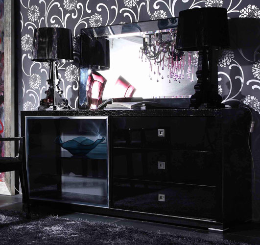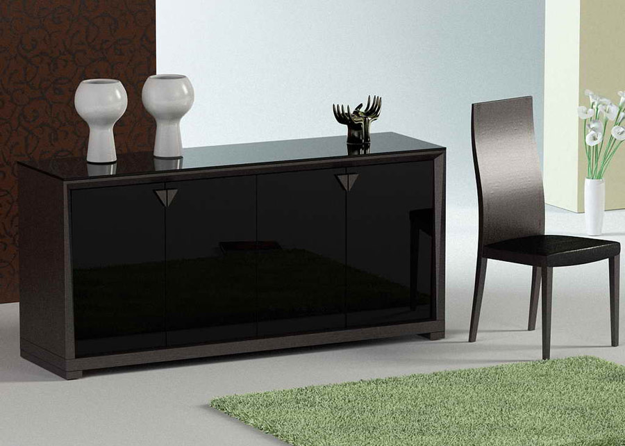 High black 4-door buffet with crocodile texture lacquer finish. Inside houses three shelves. Touch opening mechanism. Also available in white crocodile finish.