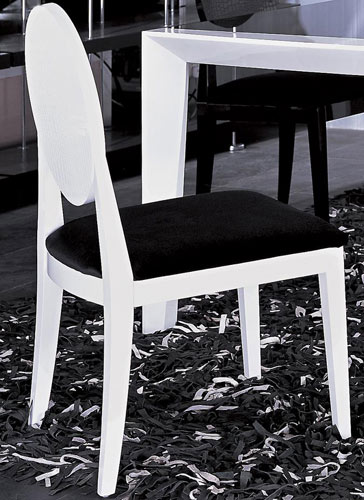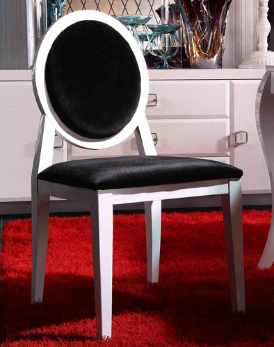 Chairs come in either white or black high gloss lacquer finish with black fabric upholstered back and seat.