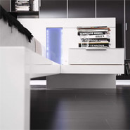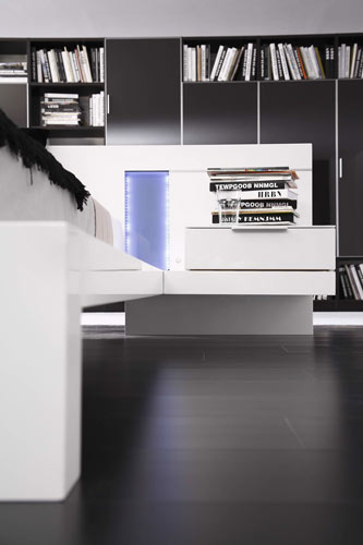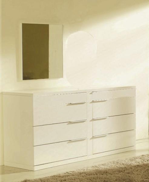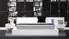 No less than an award winning contemporary design is featured in this Alaska Modern White Lacquer Bed. Together with the ambient blue light on the headboard, and the long LED ambient blue light that runs down the bed rail, this contemporary piece of furniture is the pinnacle of the contemporary bedroom. Nightstands are attached and included in price for an overall look that is just fabulous and unique. Matching dresser and available in black.