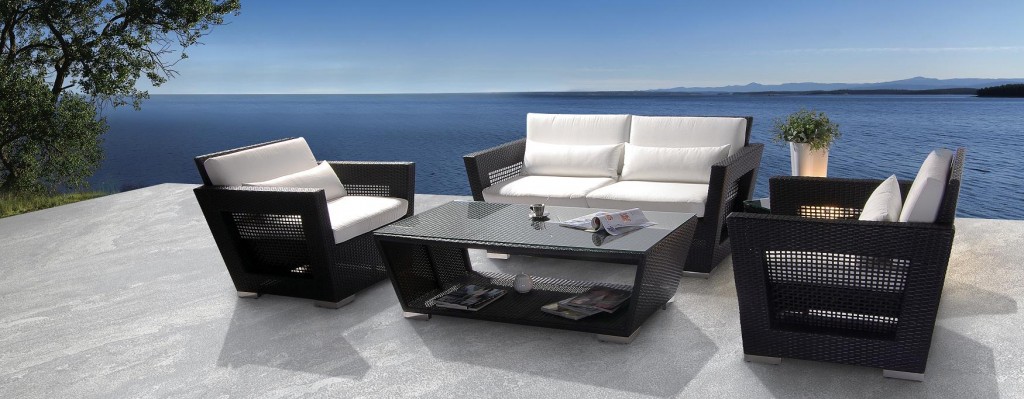 This is a 4 piece modern black and white patio set that includes everything except for the accessories. It features a modern sleek design and is waterproof for added protection.