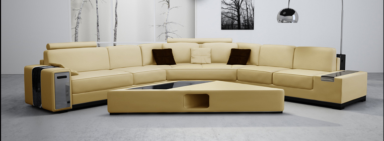 Contemporary L-shaped sectional sofa made with the finest materials and exquisite design. Beige upholstery is made from real leather front cover with high quality leather match on the back for durability. Unique features include storage compartment on the right side arm rest, cowhide accent on the arms and pillows, comfortable cushion level fit for body and back support and exceptional sofa framework. This sofa also includes a uniquely designed complementary coffee table. Customizable leather covering by special request.